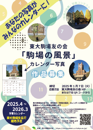 東大駒場友の会では来年度(2025年4月~2026年3月)の学事付きカレンダーの製作にあたり、『駒場の風景』をテーマに掲載写真を募集します。東大駒場友の会事務局運営委員の教員による審査委員会で作品を選び、月ごとに1枚の写真を掲載します。このカレンダーは、入会促進等のために使用するほか生協駒場店でも販売いたします。 奮ってご応募ください。