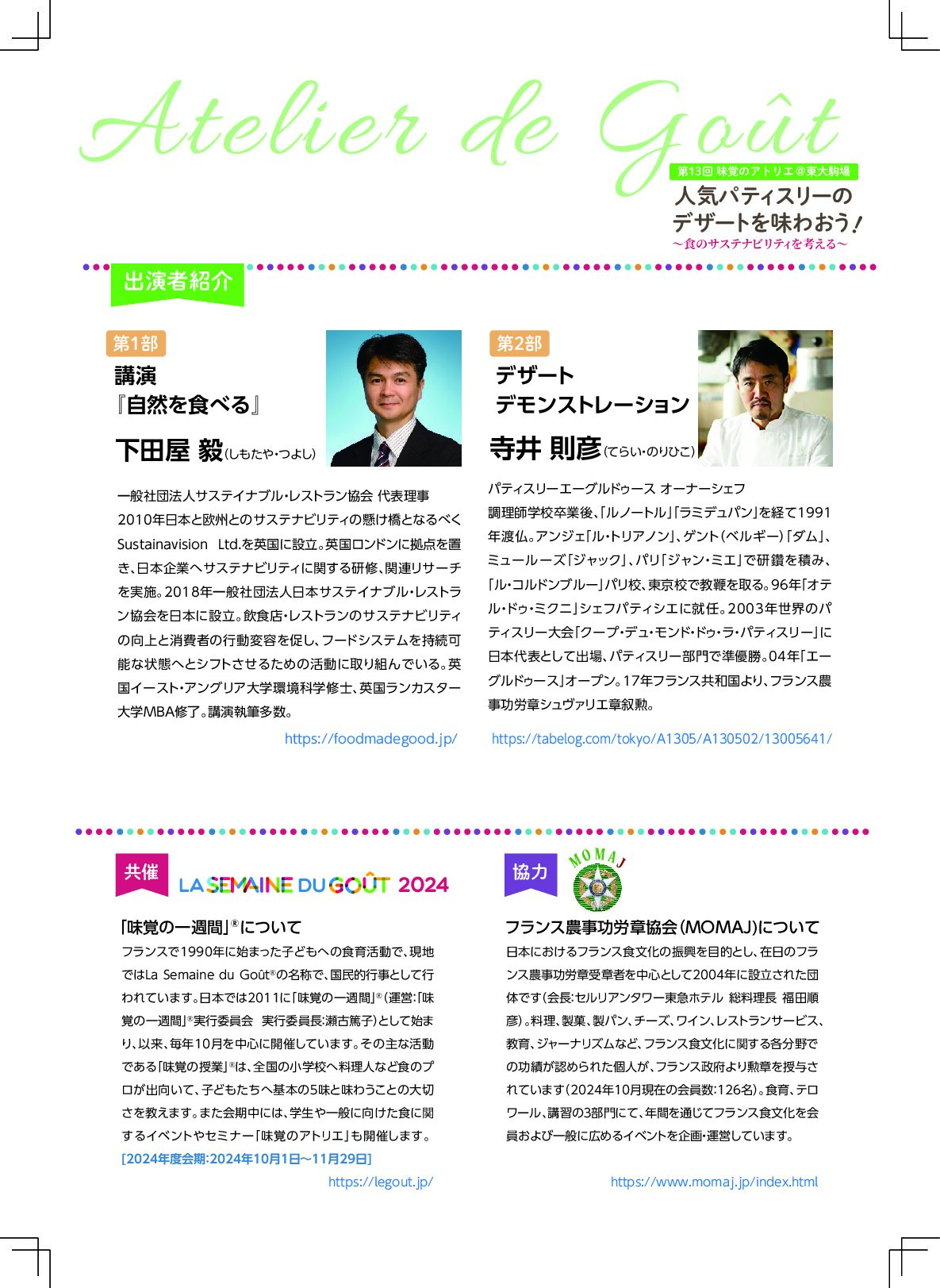 第二部は目白の人気パティスリー、エーグルドゥースオーナーシェフの寺井則彦氏による、 食材のルーツを学びながらのデザートデモンストレーションと試食です。