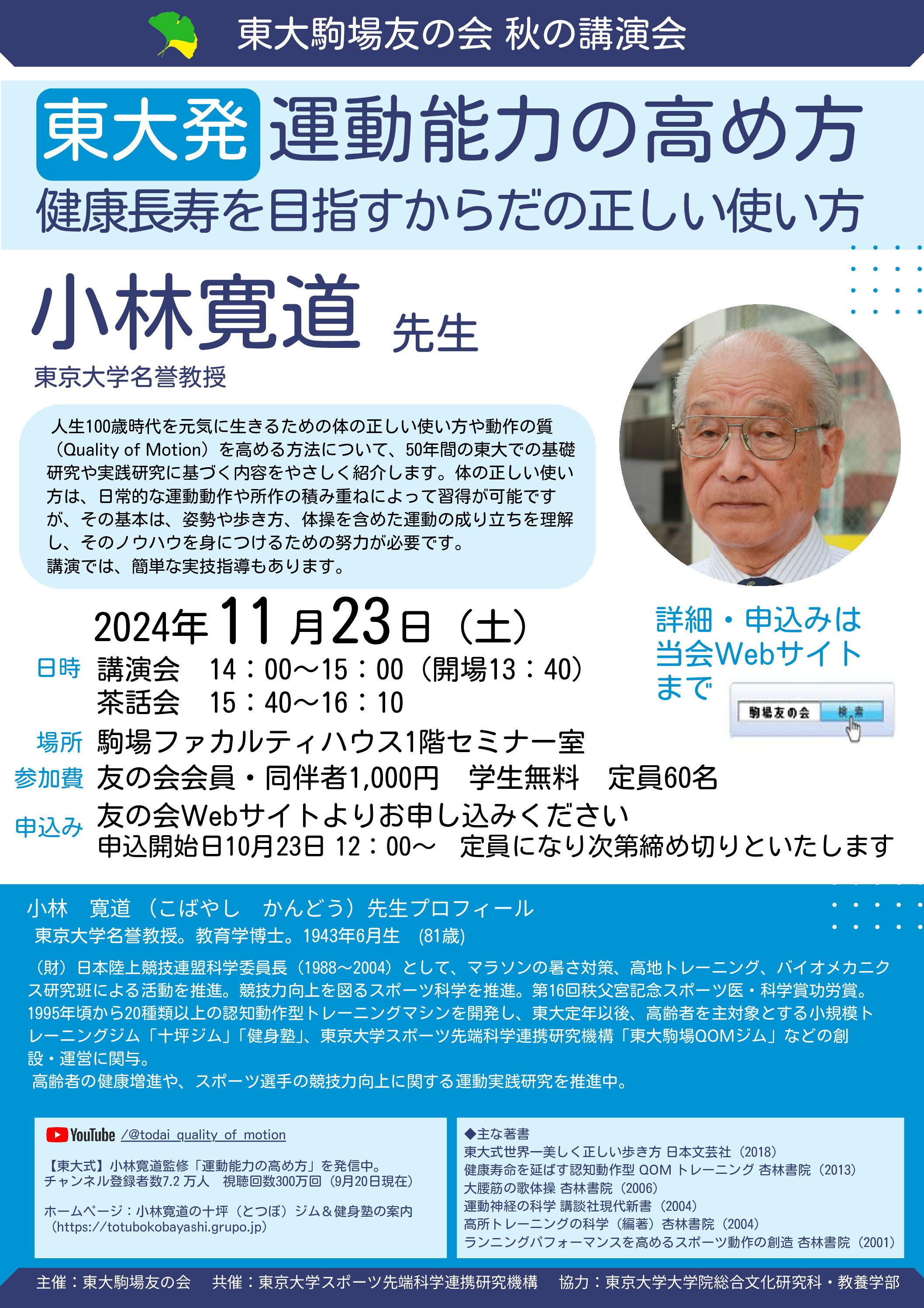 今年度の東大駒場友の会秋の講演会は、以下の通り、開催いたします。
