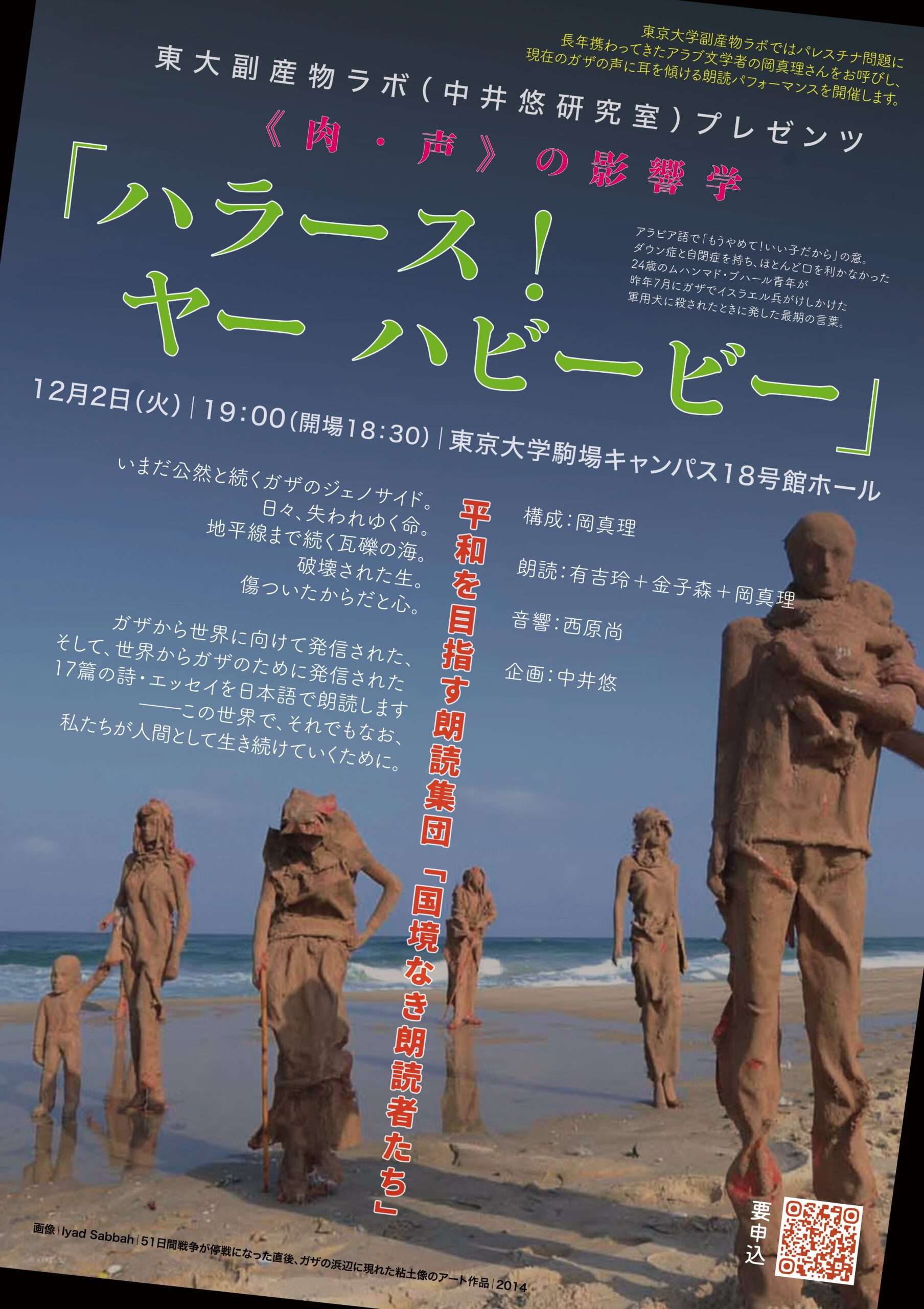 朗読:有吉玲+金子森+岡真理(平和を目指す朗読集団「国境なき朗読者たち」)