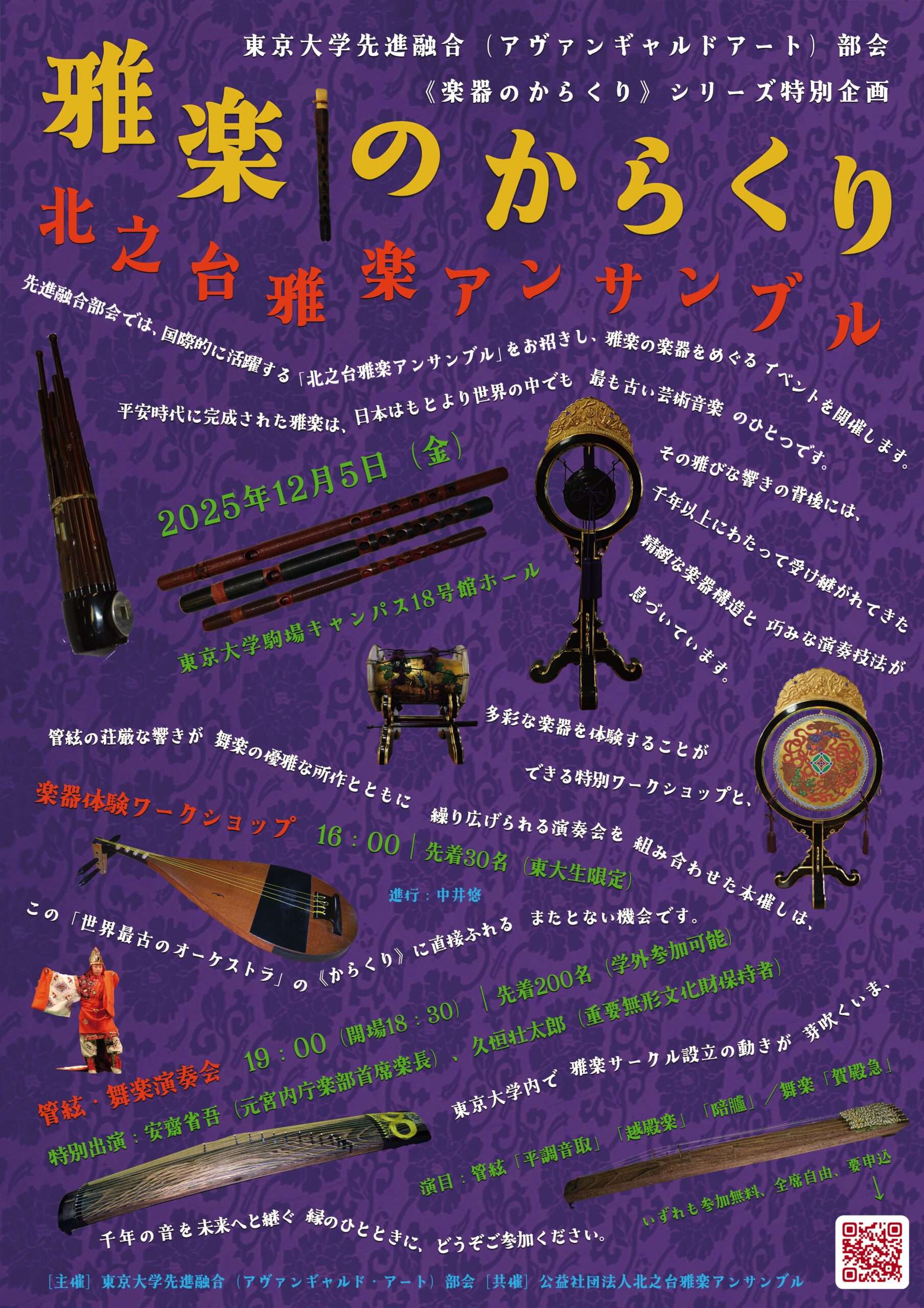 国際的に活躍する「北之台雅楽アンサンブル」をお招きし、雅楽の楽器をめぐるイベントを開催します。平安時代に完成された雅楽は、日本はもとより世界の中でも最も古い芸術音楽のひとつです。その雅びな響きの背後には、千年以上にわたって受け継がれてきた精緻な楽器構造と巧みな演奏技法が息づいています。多彩な楽器を体験することができる特別ワークショップと、管絃の荘厳な響きが舞楽の優雅な所作とともに繰り広げられる演奏会を組み合わせた本催しは、この「世界最古のオーケストラ」の《からくり》に直接ふれるまたとない機会です。東京大学内で雅楽サークル設立の動きが芽吹くいま、千年の音を未来へと継ぐ縁のひとときに、どうぞご参加ください。